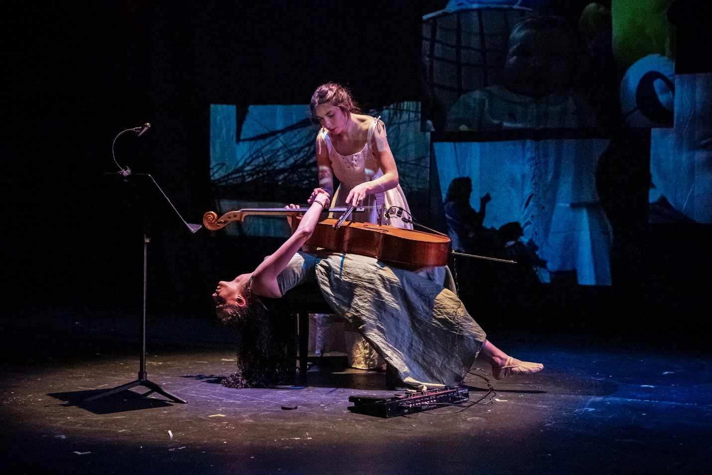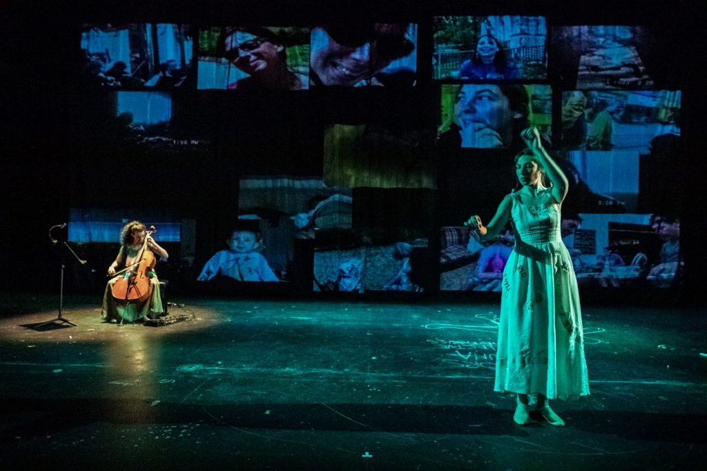 Apoyándola hay dos manifestaciones del subconsciente: Virgilia -representada por Hannah Pederson-, una extravagante guía metateatral con el espíritu de un caótico Arlecchino, y Memi -representada por Ceridwen McCooey-, una violonchelista inquietante cuya música en vivo subraya la arquitectura emocional de la pieza. Virgilia, interpretada con humor mordaz y precisión, ofrece el comentario más agudo de la obra, atravesando tanto el sufrimiento artístico como las expectativas institucionales. El violonchelo de Memi, por el contrario, habla donde el lenguaje falla: sus crescendos y rupturas reflejan el costo psíquico de la excavación.